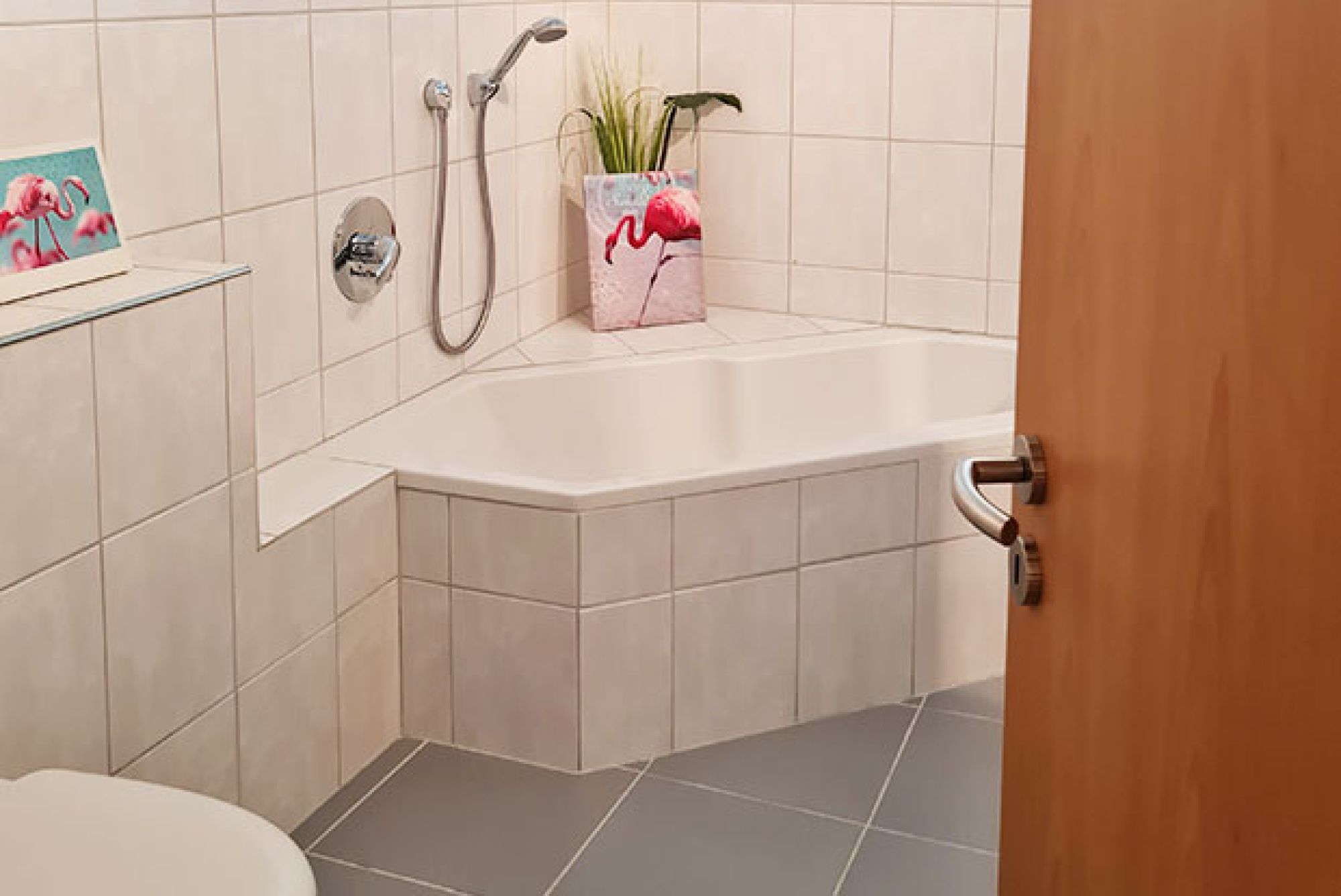 Im Badezimmer finden Sie WC/Dusche und eine Eckbadewanne.
